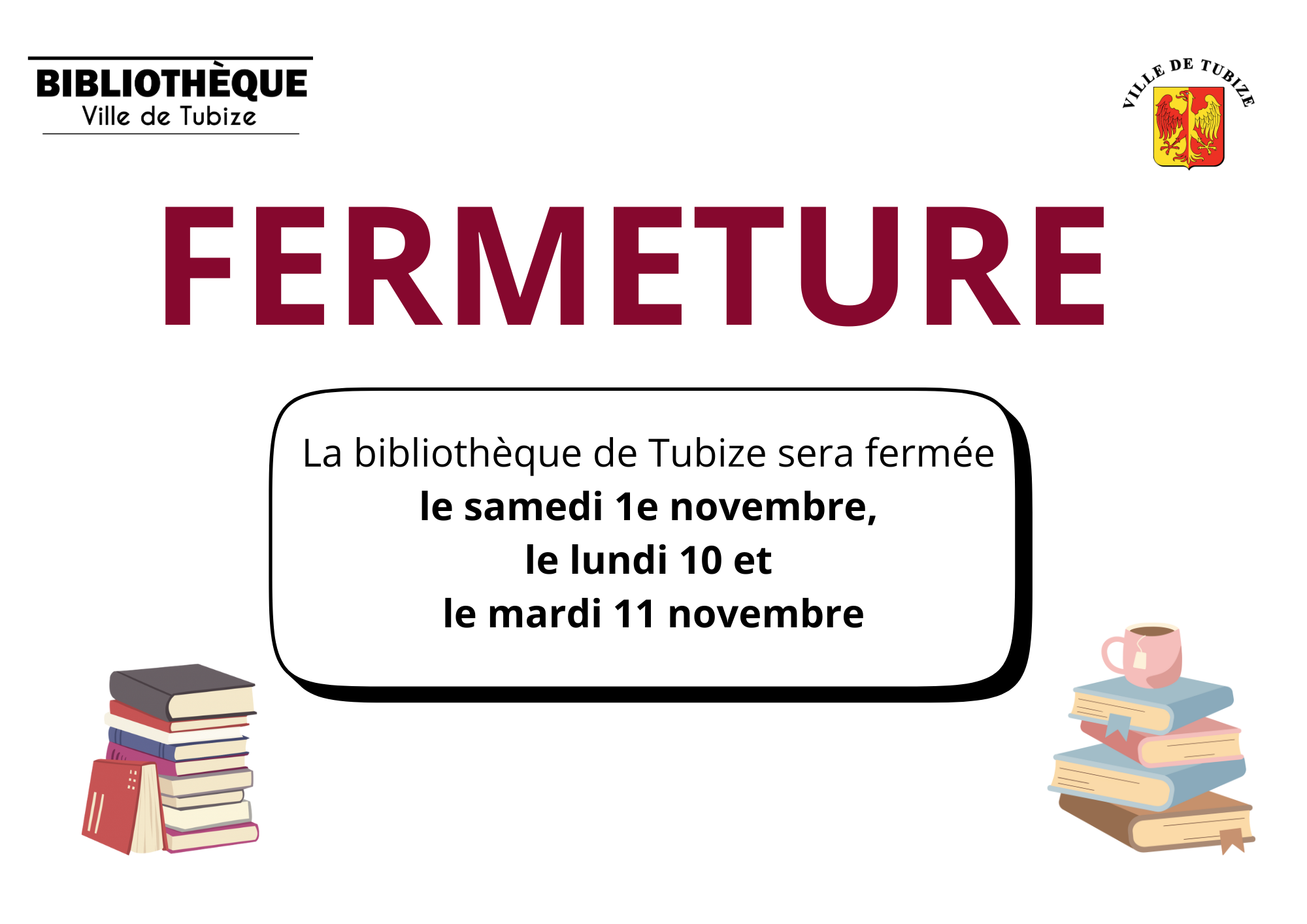 La bibliothèque de Tubize sera fermée ce samedi 1e novembre ainsi que le lundi 10 et le mardi 11 novembre.