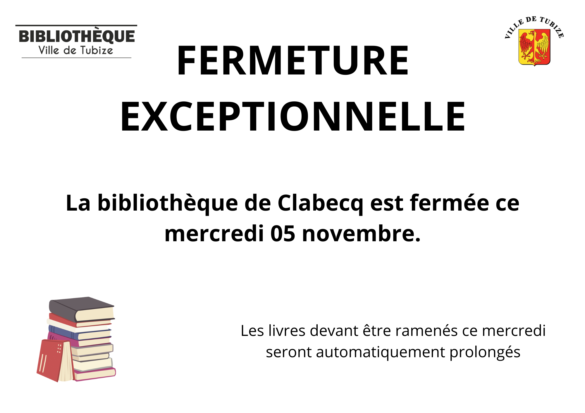 La bibliothèque de Clabecq sera fermée exceptionnellement ce mercredi 5 novembre 2025.